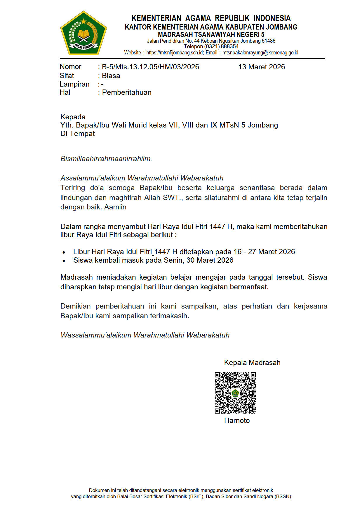 "Menjadi bagian dari MTsN 5 Jombang adalah pengalaman yang tak terlupakan. Selama di sini, saya tidak hanya diajarkan ilmu pengetahuan, tetapi juga nilai-nilai kehidupan yang membentuk karakter saya. Guru-guru yang peduli dan fasilitas yang mendukung sangat membantu saya dalam mencapai prestasi. Terima kasih MTsN 5 Jombang, saya siap melangkah ke jenjang berikutnya dengan bekal yang kuat!"