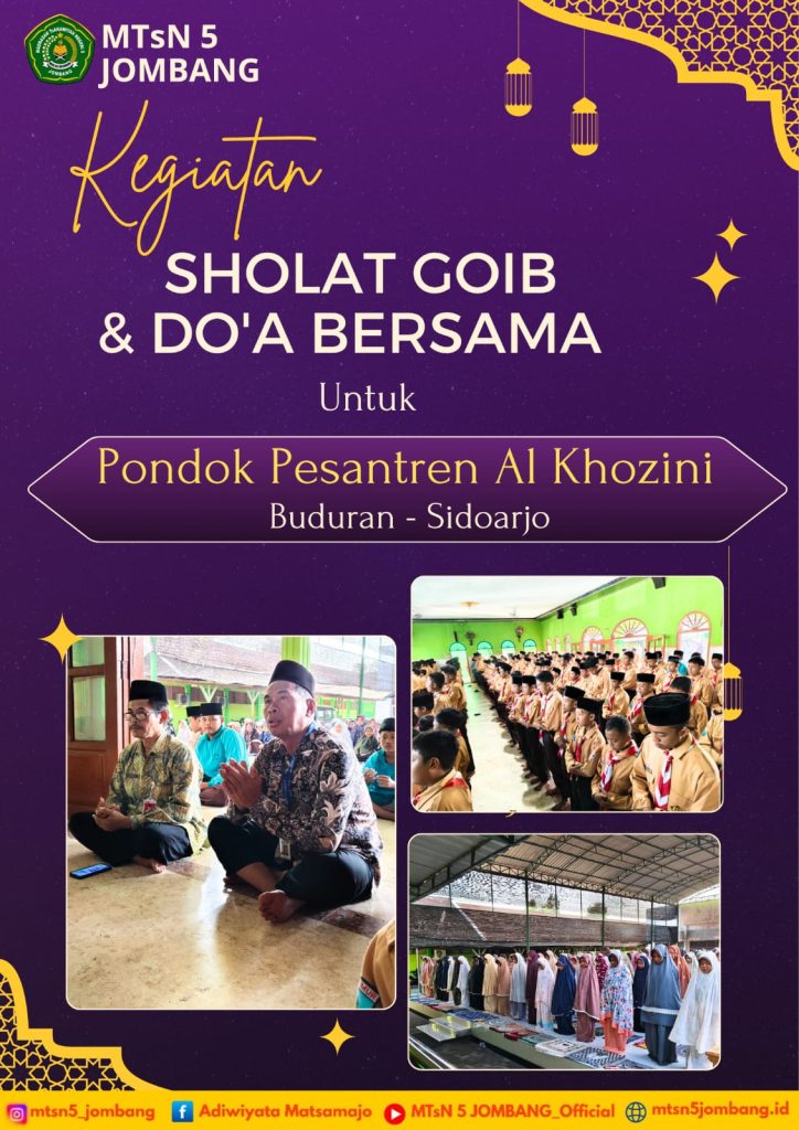 Jombang, 3 Oktober 2025 — Keluarga besar MTsN 5 Jombang menggelar Sholat Ghoib dan Istighosah sebagai bentuk doa bersama bagi santri Pondok Pesantren Al Khozini Buduran Sidoarjo yang sedang mengalami musibah. Kegiatan yang dilaksanakan pada Jumat pagi ini diikuti oleh seluruh tenaga pendidik dan ratusan siswa dengan penuh kekhusyukan.